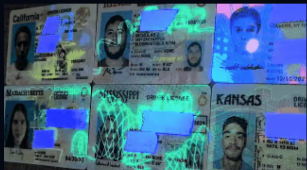 Using UV or black light, the card will reveal a specific pattern or marking that matches the appearance of a real ID card.